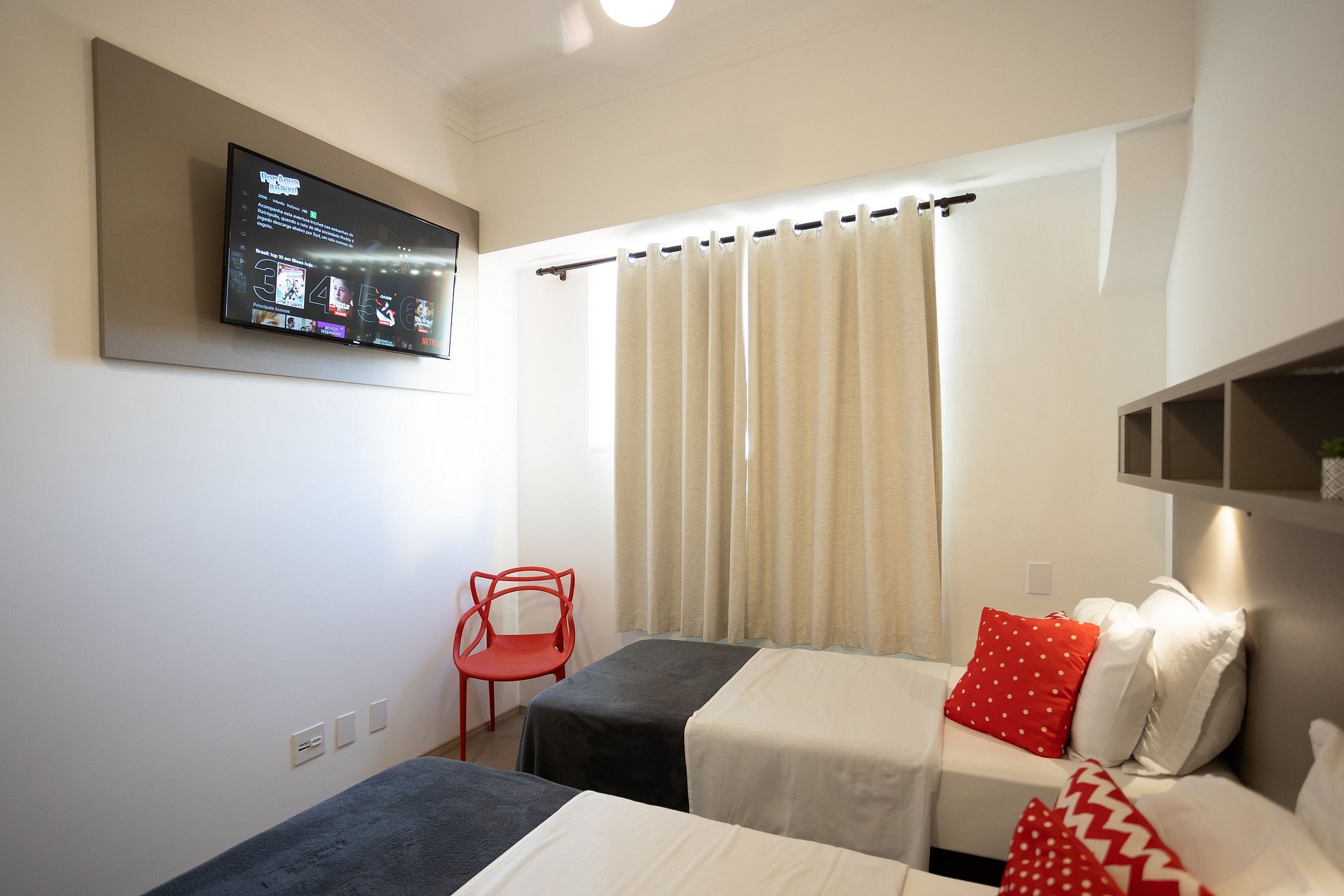 Todos os ambientes contam com ventilador de teto, internet de alta velocidade e TVs Smart, para que você possa acessar suas contas de streaming com total comodidade.