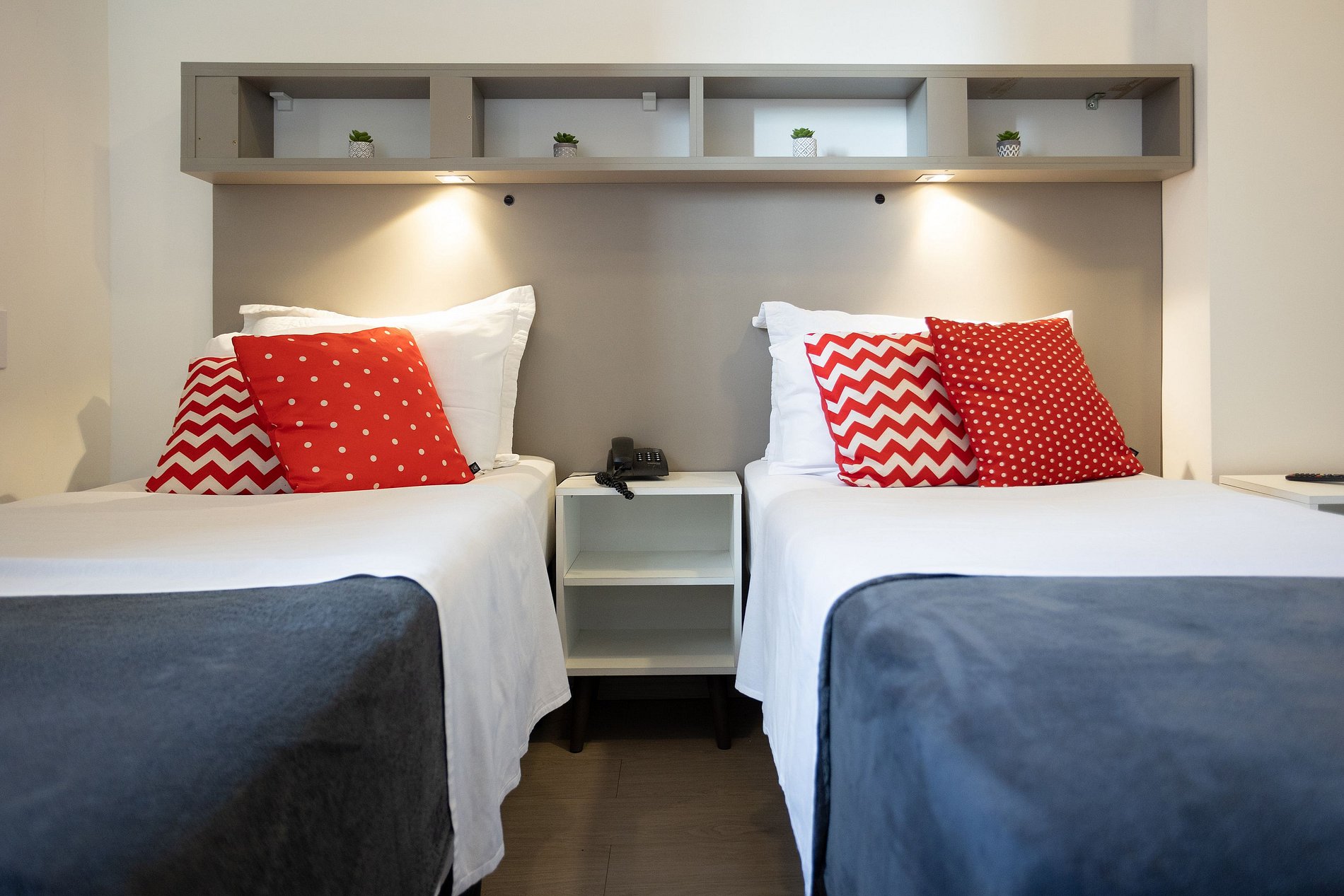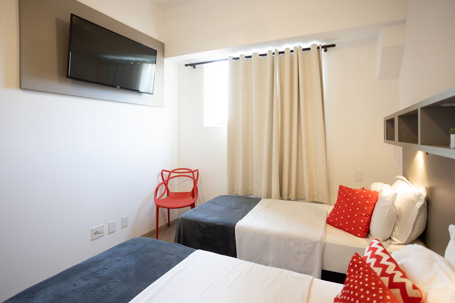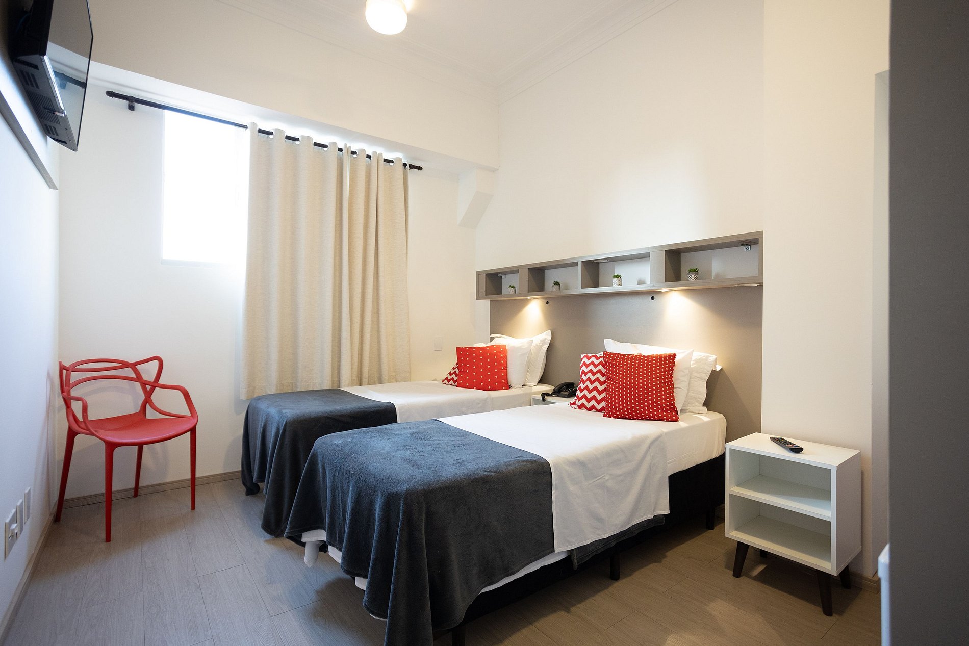 Esse modelo suíte privativa acomoda 1 ou 2 pessoas. Originalmente a acomodação está montada com duas camas de solteiro, tamanho padrão independentes. Temos mais unidades no mesmo prédio, inclusive no formato cama der casal. Muitos dos nossos hóspedes se tornam clientes recorrentes, porque reconhecem a praticidade, o bom atendimento e custo x benefício que oferecemos com nossa estrutura. Para estadias acima de 10 noites, limpeza e troca de enxoval são cortesia. Quem fica uma vez, costuma voltar!