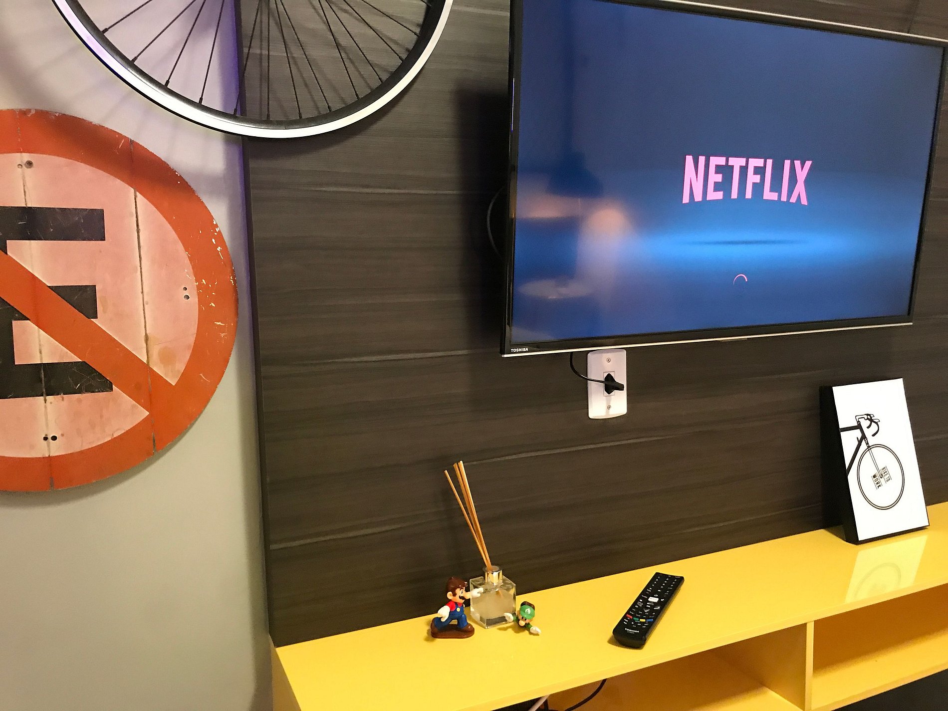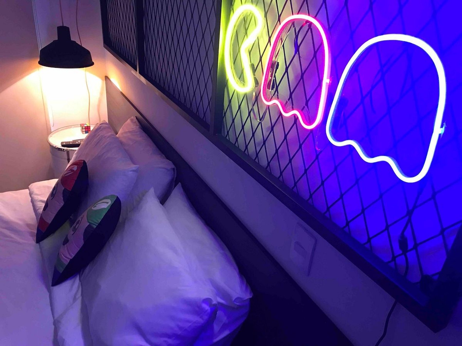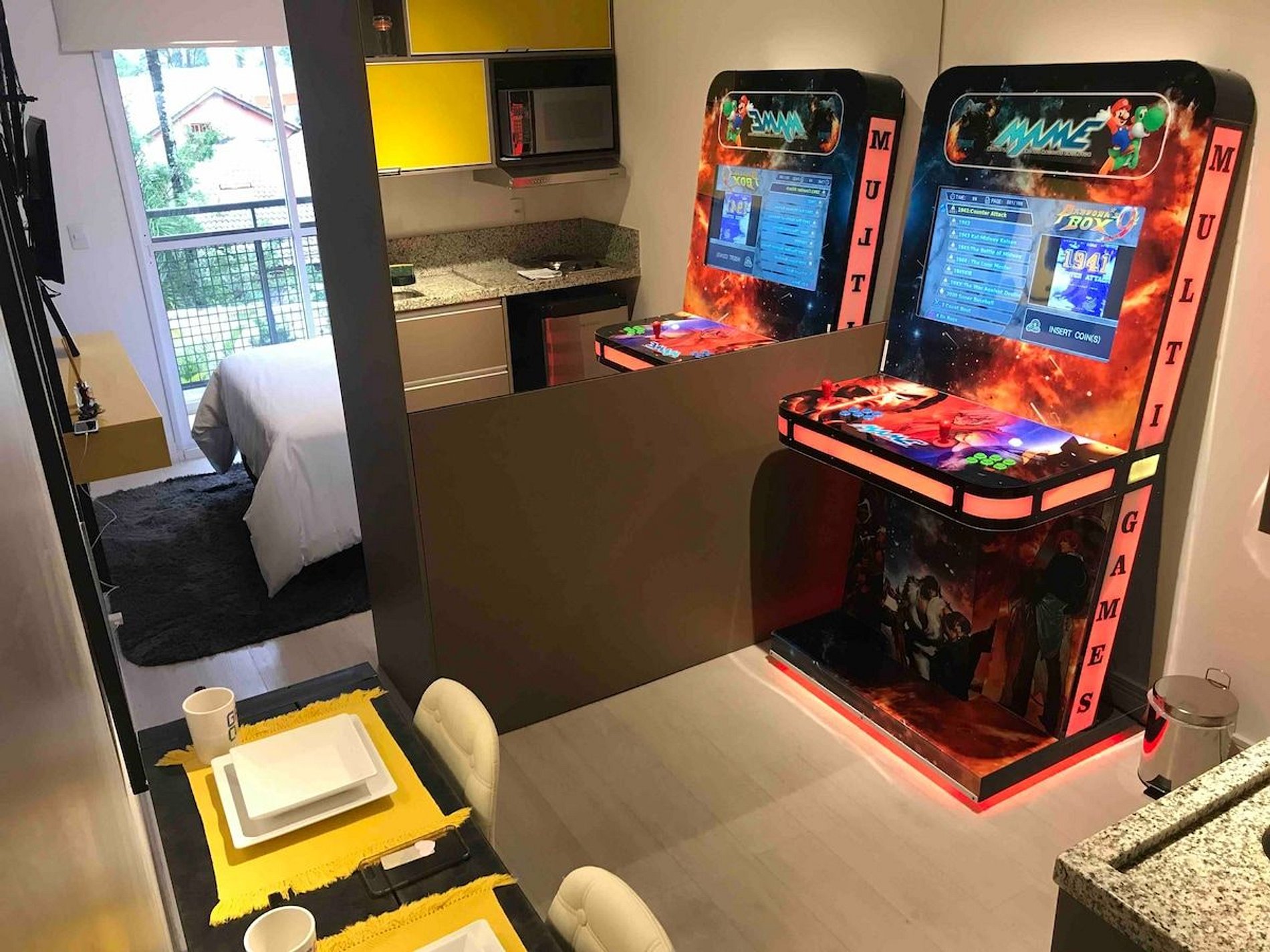 Apartamento com decoração industrial no tema “game” com uma máquina de fliperama multijogos dentro do Studio. Na principal avenida da Granja Viana / Cotia.