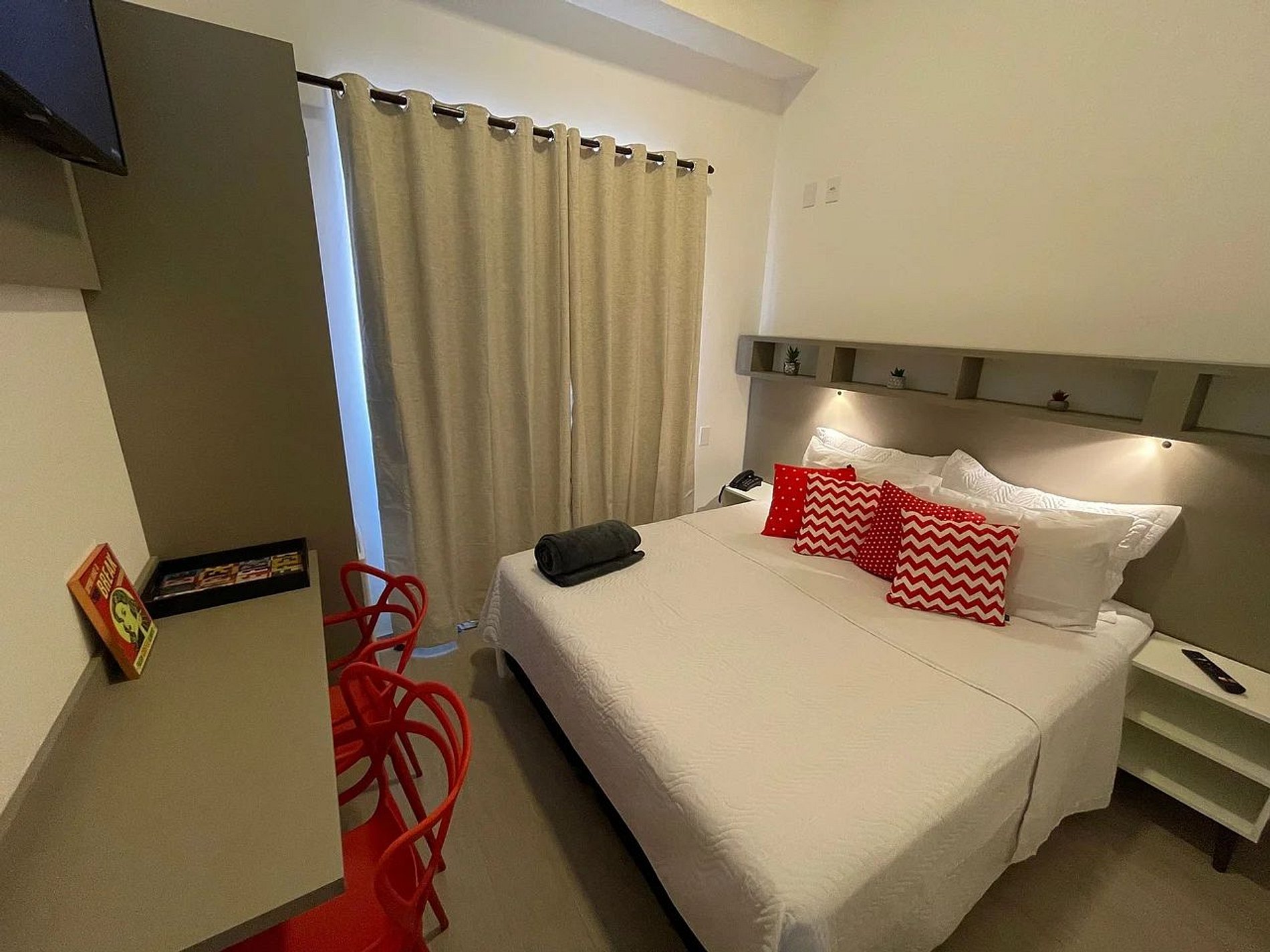 Esse modelo suíte acomoda 1 ou 2 pessoas em cama de casal, largura padrão. Se comparar com outras unidades do mesmo prédio, esse anúncio tem um valor ligeiramente mais barato, pois é uma suite mais compacta do que as demais de tamanho e valor padrão. Muitos dos nossos hóspedes se tornam clientes recorrentes, porque reconhecem a praticidade, o bom atendimento e custo x benefício que oferecemos com nossa estrutura. Para estadias acima de 10 noites, limpeza e troca de enxoval são cortesia. Quem fica uma vez, costuma voltar!